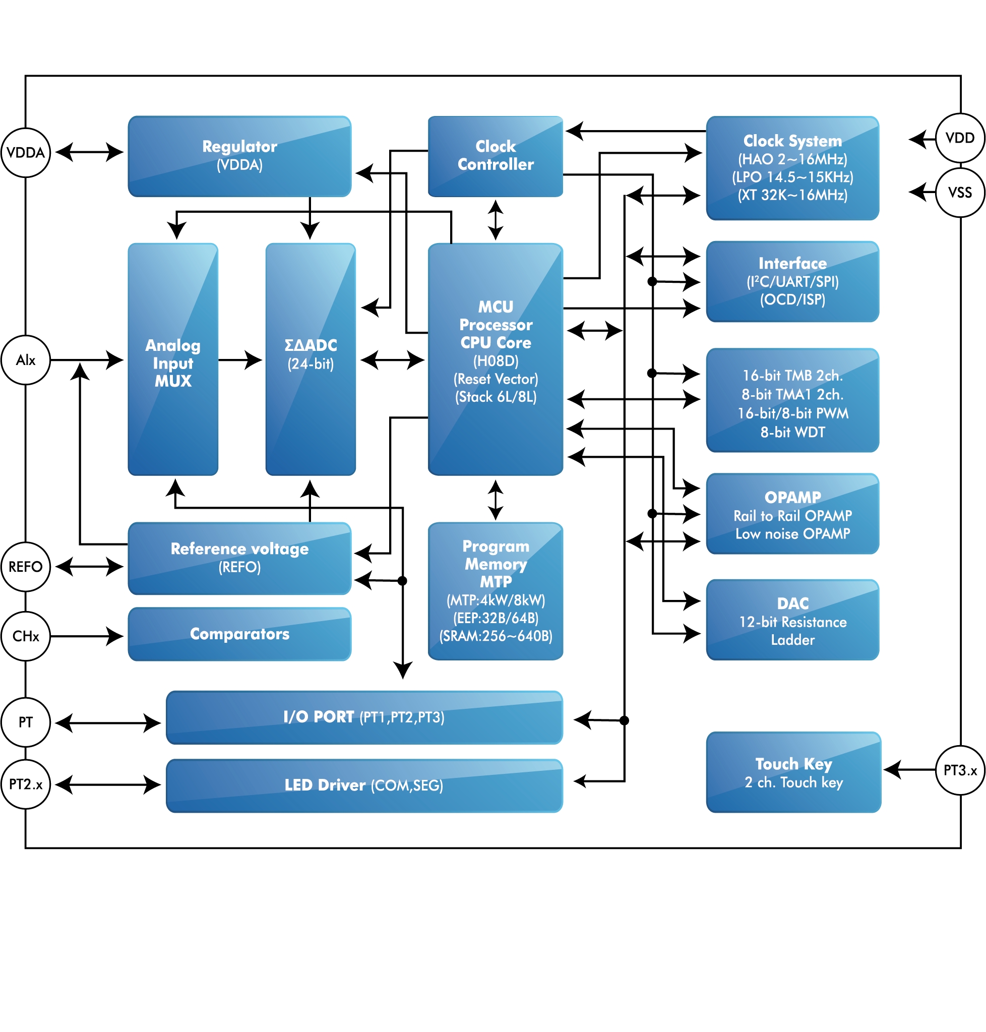 - 4K/8K words MTP程式記憶體(燒錄次數100次)